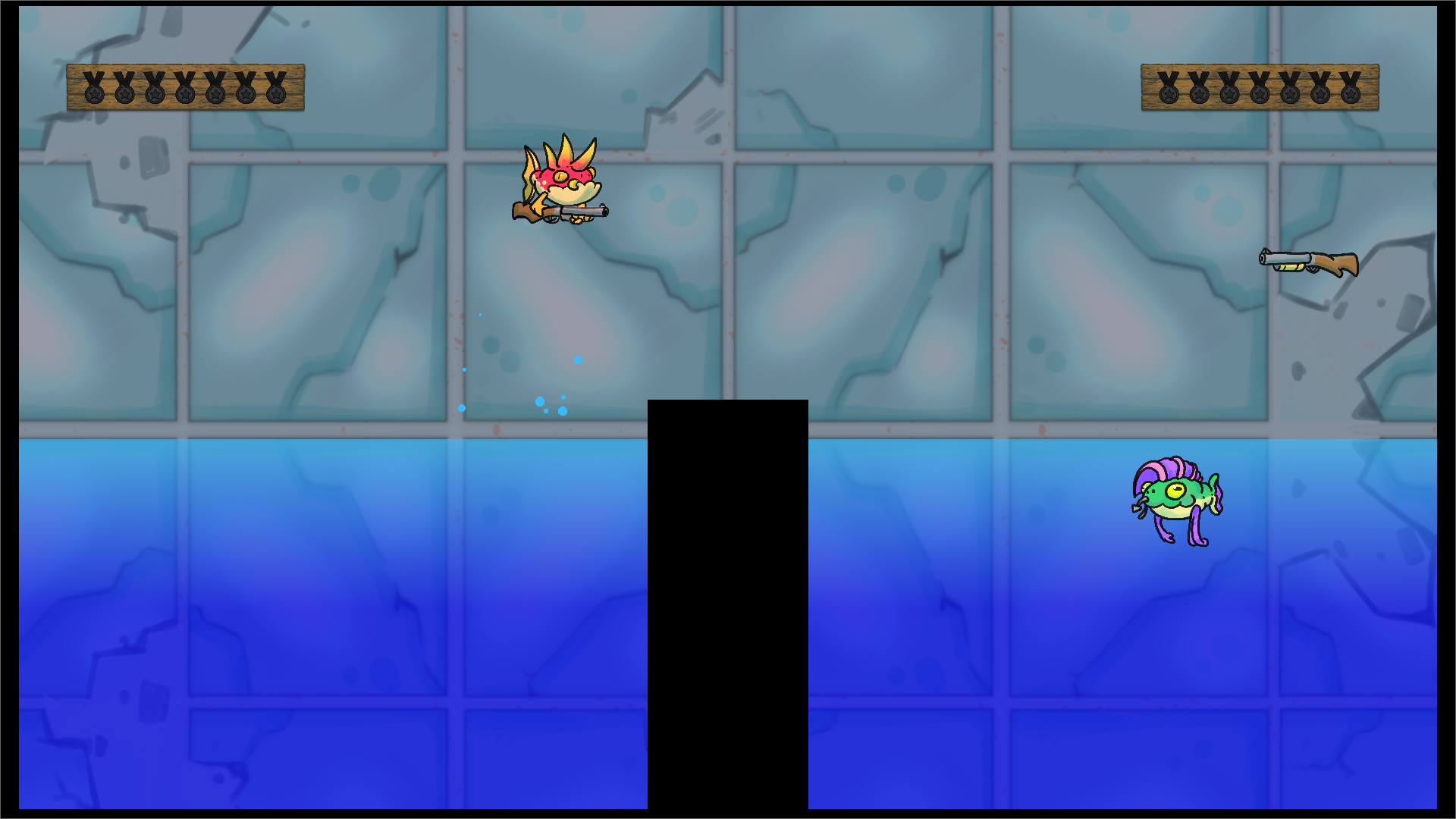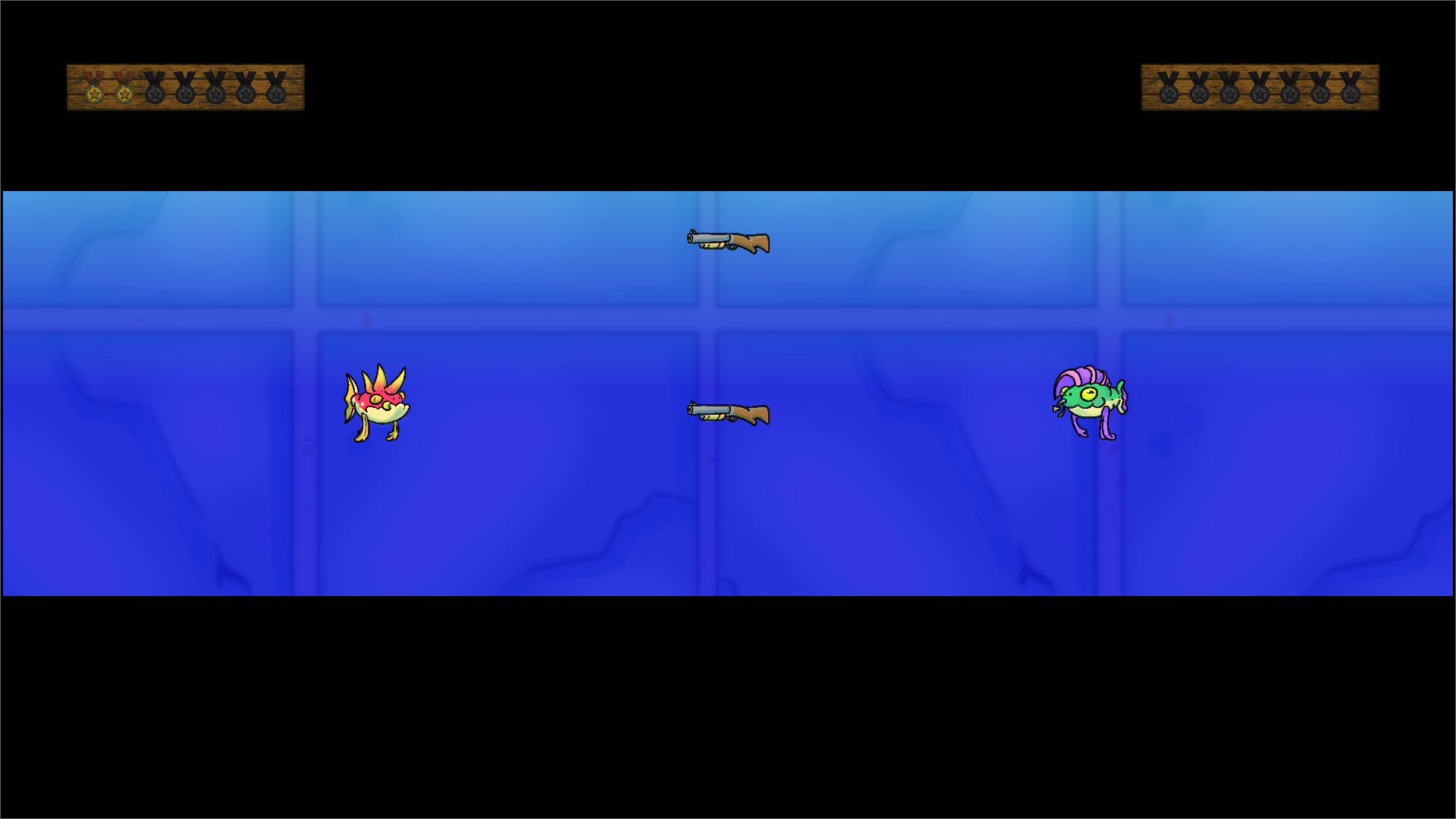 2 Player battles with punk fishes. Be the first to grab the gun or die an humiliating death.
